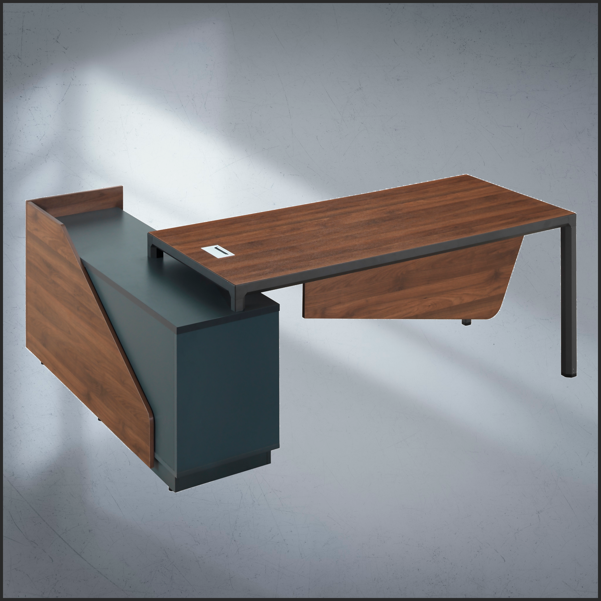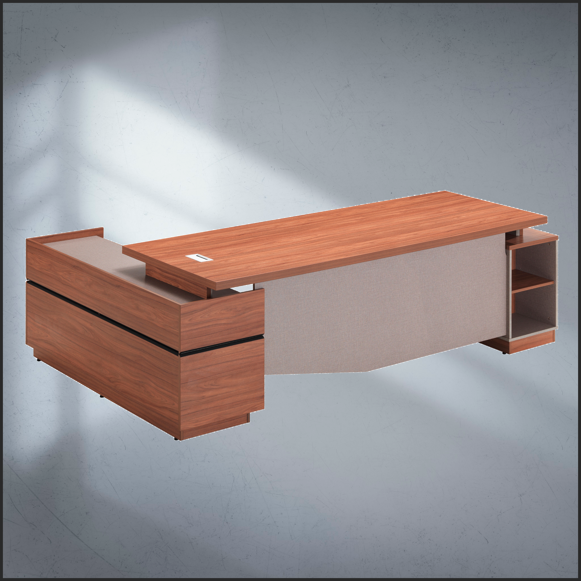 - All-in-one desk with drawers and cabinets.